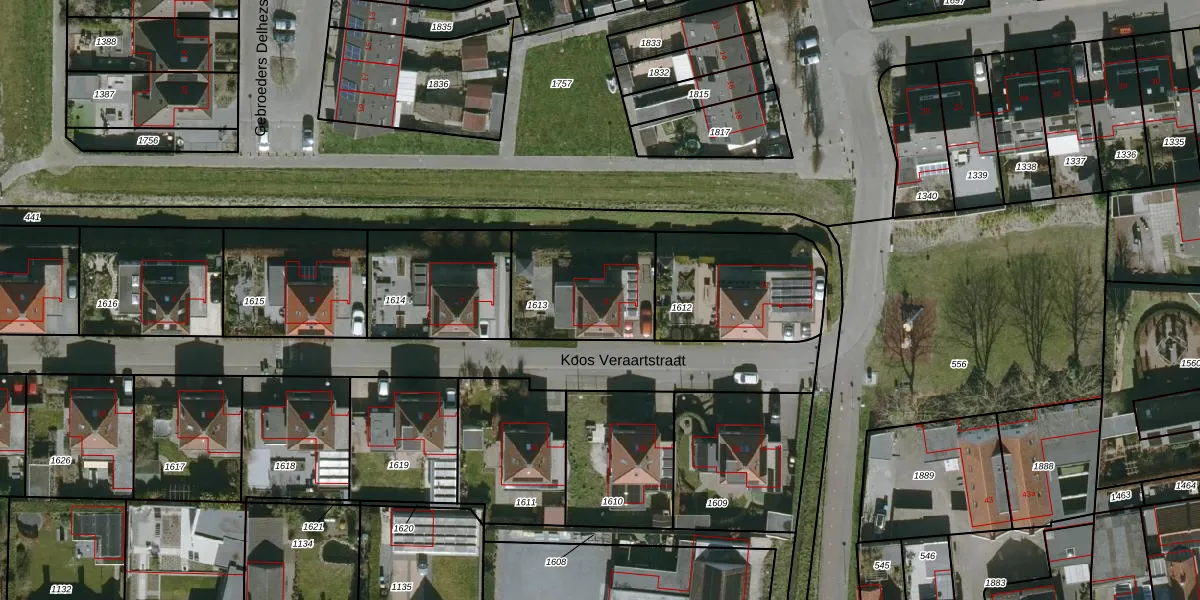 Koos Veraartstraat 9 is gelegen op kadastraal perceel SBG02F1613. Deze kadastrale aanduiding is uniek en wordt gebruikt door het Kadaster om eigendomsrechten en andere zakelijke rechten vast te leggen. Het perceel maakt onderdeel uit van de kadastrale gemeente Steenbergen.