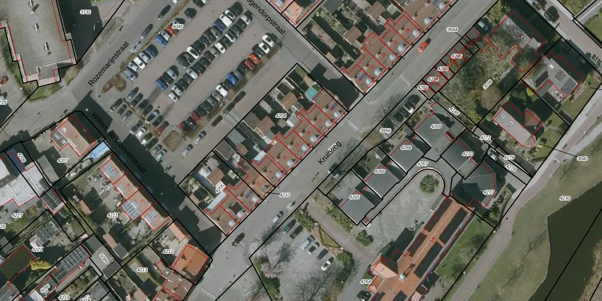 Het perceel waarop Kruitweg 13 staat heeft een oppervlakte van 827 m². Dit is een groot perceel. De perceeloppervlakte wordt geregistreerd door het Kadaster. Gedetailleerde informatie over de maten van dit perceel kunt u vinden in het rapport Kadastrale kaart met maatvoering van Kruitweg 13.