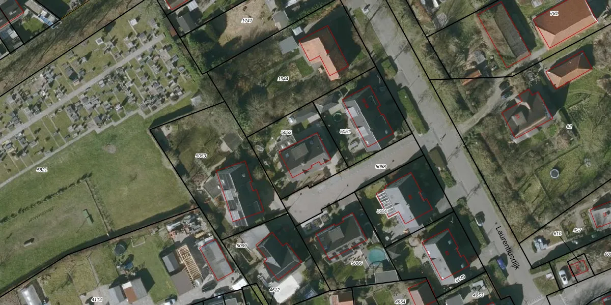Het perceel waarop Laurentiusdijk 52 staat heeft een oppervlakte van 591 m². Dit is een groot perceel. De perceeloppervlakte wordt geregistreerd door het Kadaster. Gedetailleerde informatie over de maten van dit perceel kunt u vinden in het rapport Kadastrale kaart met maatvoering van Laurentiusdijk 52.