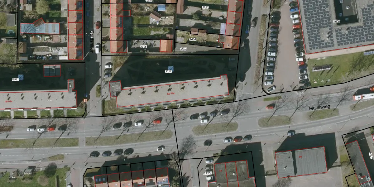 Het perceel waarop Molenweg 75 staat heeft een oppervlakte van 2084 m². Dit is een zeer groot perceel. De perceeloppervlakte wordt geregistreerd door het Kadaster. Gedetailleerde informatie over de maten van dit perceel kunt u vinden in het rapport Kadastrale kaart met maatvoering van Molenweg 75.
