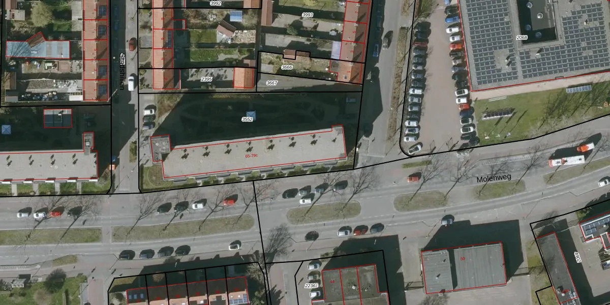 Het perceel waarop Molenweg 77 staat heeft een oppervlakte van 2084 m². Dit is een zeer groot perceel. De perceeloppervlakte wordt geregistreerd door het Kadaster. Gedetailleerde informatie over de maten van dit perceel kunt u vinden in het rapport Kadastrale kaart met maatvoering van Molenweg 77.