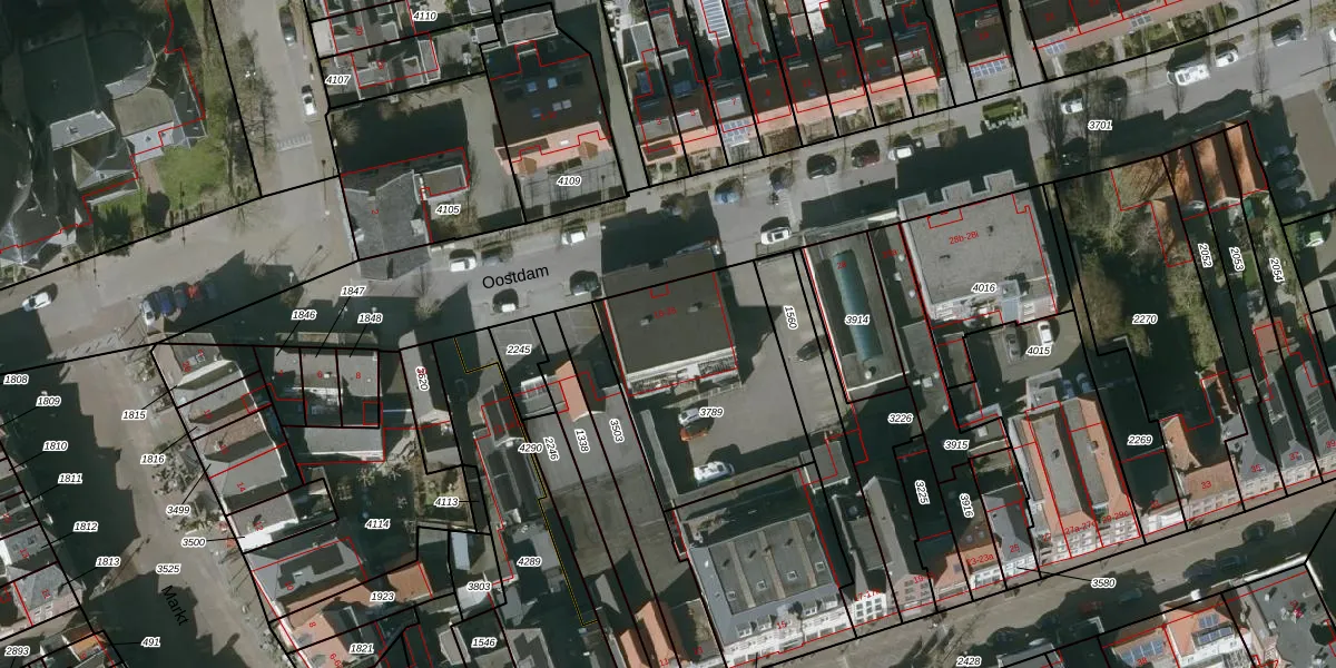 Het perceel waarop Oostdam 20 staat heeft een oppervlakte van 780 m². Dit is een groot perceel. De perceeloppervlakte wordt geregistreerd door het Kadaster. Gedetailleerde informatie over de maten van dit perceel kunt u vinden in het rapport Kadastrale kaart met maatvoering van Oostdam 20.
