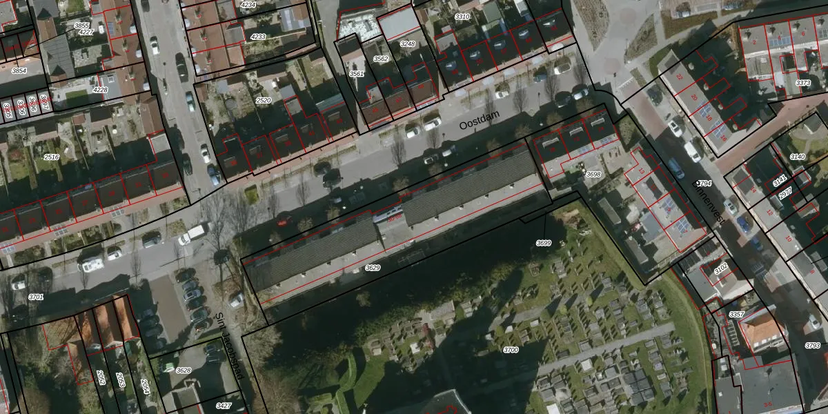 Het perceel waarop Oostdam 50 staat heeft een oppervlakte van 1300 m². Dit is een zeer groot perceel. De perceeloppervlakte wordt geregistreerd door het Kadaster. Gedetailleerde informatie over de maten van dit perceel kunt u vinden in het rapport Kadastrale kaart met maatvoering van Oostdam 50.
