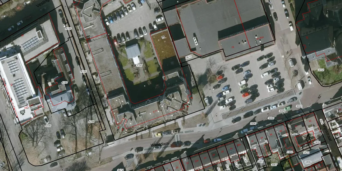Het perceel waarop Westdam 25 staat heeft een oppervlakte van 4862 m². Dit is een zeer groot perceel. De perceeloppervlakte wordt geregistreerd door het Kadaster. Gedetailleerde informatie over de maten van dit perceel kunt u vinden in het rapport Kadastrale kaart met maatvoering van Westdam 25.