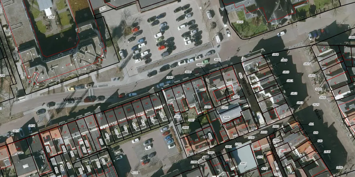 Het perceel waarop Westdam 34 staat heeft een oppervlakte van 85 m². Dit is een klein perceel. De perceeloppervlakte wordt geregistreerd door het Kadaster. Gedetailleerde informatie over de maten van dit perceel kunt u vinden in het rapport Kadastrale kaart met maatvoering van Westdam 34.