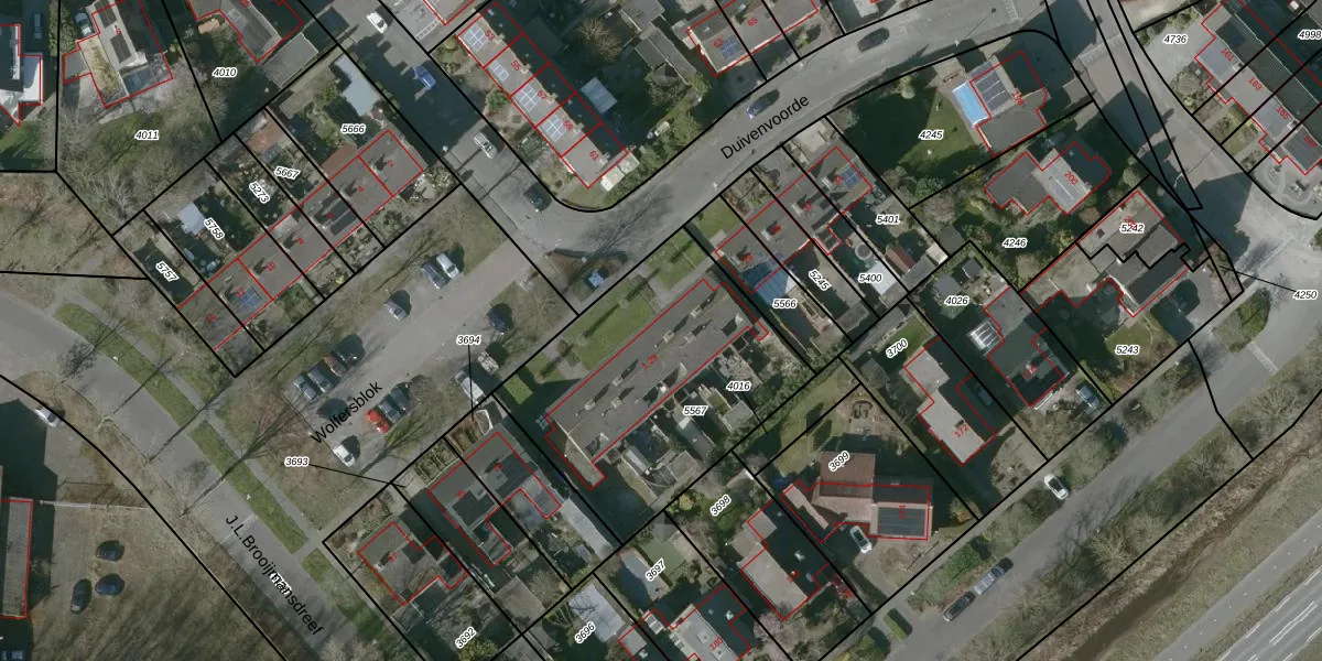 Het perceel waarop Wolfersblok 5 staat heeft een oppervlakte van 1162 m². Dit is een zeer groot perceel. De perceeloppervlakte wordt geregistreerd door het Kadaster. Gedetailleerde informatie over de maten van dit perceel kunt u vinden in het rapport Kadastrale kaart met maatvoering van Wolfersblok 5.