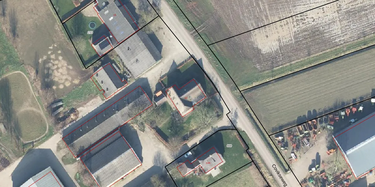 Covikseweg 13 is gelegen op kadastraal perceel SDR00V669. Deze kadastrale aanduiding is uniek en wordt gebruikt door het Kadaster om eigendomsrechten en andere zakelijke rechten vast te leggen. Het perceel maakt onderdeel uit van de kadastrale gemeente Steenderen.