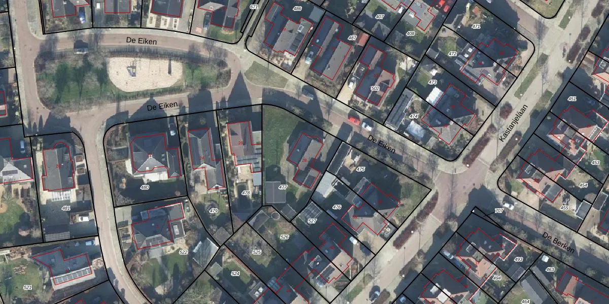 Het perceel waarop De Eiken 28 staat heeft een oppervlakte van 653 m². Dit is een groot perceel. De perceeloppervlakte wordt geregistreerd door het Kadaster. Gedetailleerde informatie over de maten van dit perceel kunt u vinden in het rapport Kadastrale kaart met maatvoering van De Eiken 28.