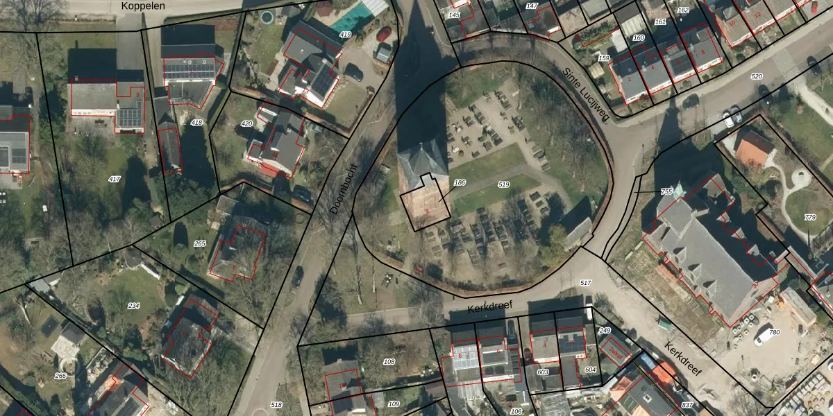 Kerkdreef 9 is gelegen op kadastraal perceel ESL00G186. Deze kadastrale aanduiding is uniek en wordt gebruikt door het Kadaster om eigendomsrechten en andere zakelijke rechten vast te leggen. Het perceel maakt onderdeel uit van de kadastrale gemeente Eersel.