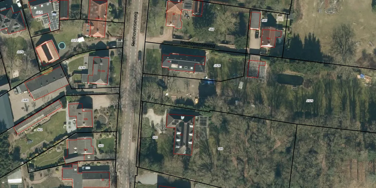 Het perceel waarop Riethovenseweg 40-A staat heeft een oppervlakte van 5858 m². Dit is een zeer groot perceel. De perceeloppervlakte wordt geregistreerd door het Kadaster. Gedetailleerde informatie over de maten van dit perceel kunt u vinden in het rapport Kadastrale kaart met maatvoering van Riethovenseweg 40-A.