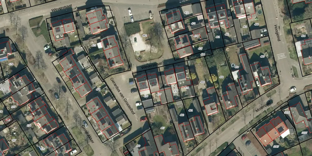 Weverstraat 21 is gelegen op kadastraal perceel ESL00G477. Deze kadastrale aanduiding is uniek en wordt gebruikt door het Kadaster om eigendomsrechten en andere zakelijke rechten vast te leggen. Het perceel maakt onderdeel uit van de kadastrale gemeente Eersel.