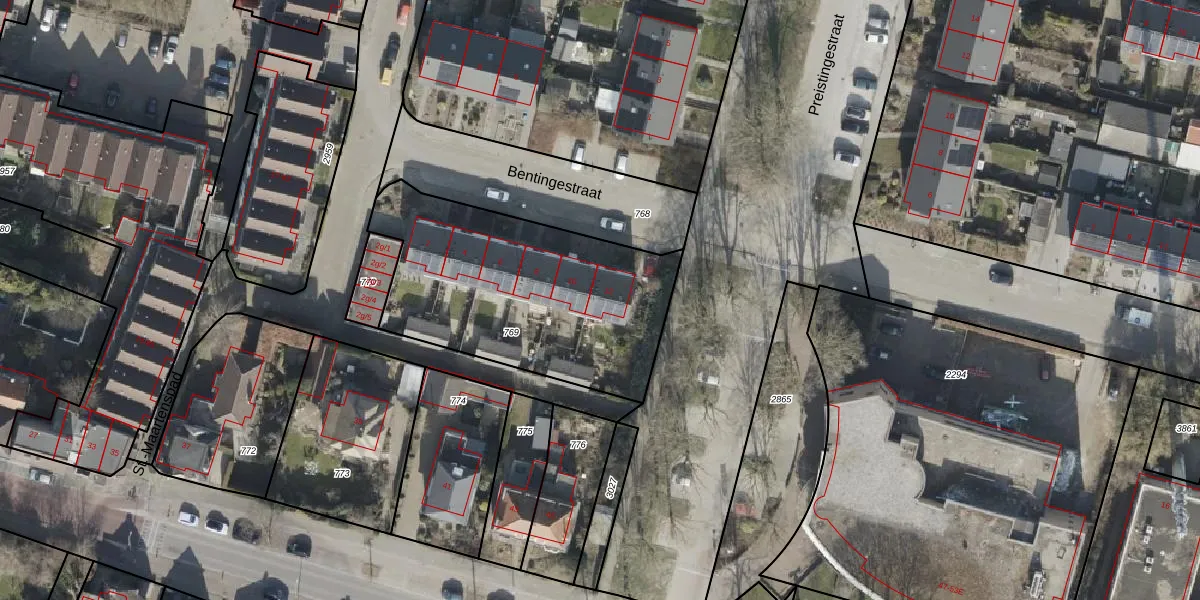Het perceel waarop Bentingestraat 12 staat heeft een oppervlakte van 1140 m². Dit is een zeer groot perceel. De perceeloppervlakte wordt geregistreerd door het Kadaster. Gedetailleerde informatie over de maten van dit perceel kunt u vinden in het rapport Kadastrale kaart met maatvoering van Bentingestraat 12.