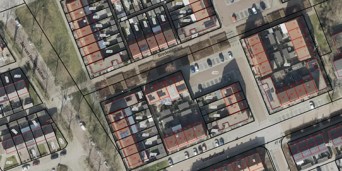 Het perceel waarop Brederostraat 3 staat heeft een oppervlakte van 1152 m². Dit is een zeer groot perceel. De perceeloppervlakte wordt geregistreerd door het Kadaster. Gedetailleerde informatie over de maten van dit perceel kunt u vinden in het rapport Kadastrale kaart met maatvoering van Brederostraat 3.