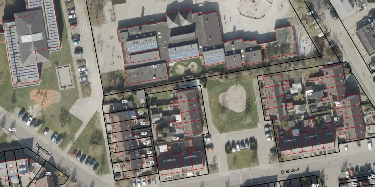 Het perceel waarop Driestoel 15 staat heeft een oppervlakte van 1340 m². Dit is een zeer groot perceel. De perceeloppervlakte wordt geregistreerd door het Kadaster. Gedetailleerde informatie over de maten van dit perceel kunt u vinden in het rapport Kadastrale kaart met maatvoering van Driestoel 15.