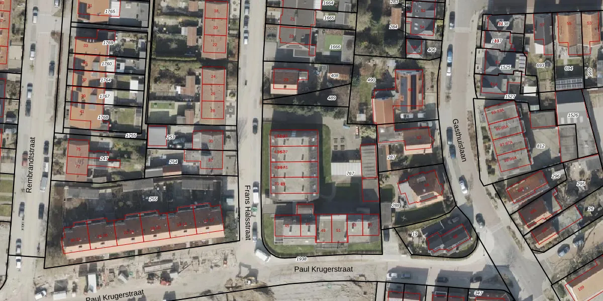 Het perceel waarop Frans Halsstraat 65 staat heeft een oppervlakte van 1875 m². Dit is een zeer groot perceel. De perceeloppervlakte wordt geregistreerd door het Kadaster. Gedetailleerde informatie over de maten van dit perceel kunt u vinden in het rapport Kadastrale kaart met maatvoering van Frans Halsstraat 65.