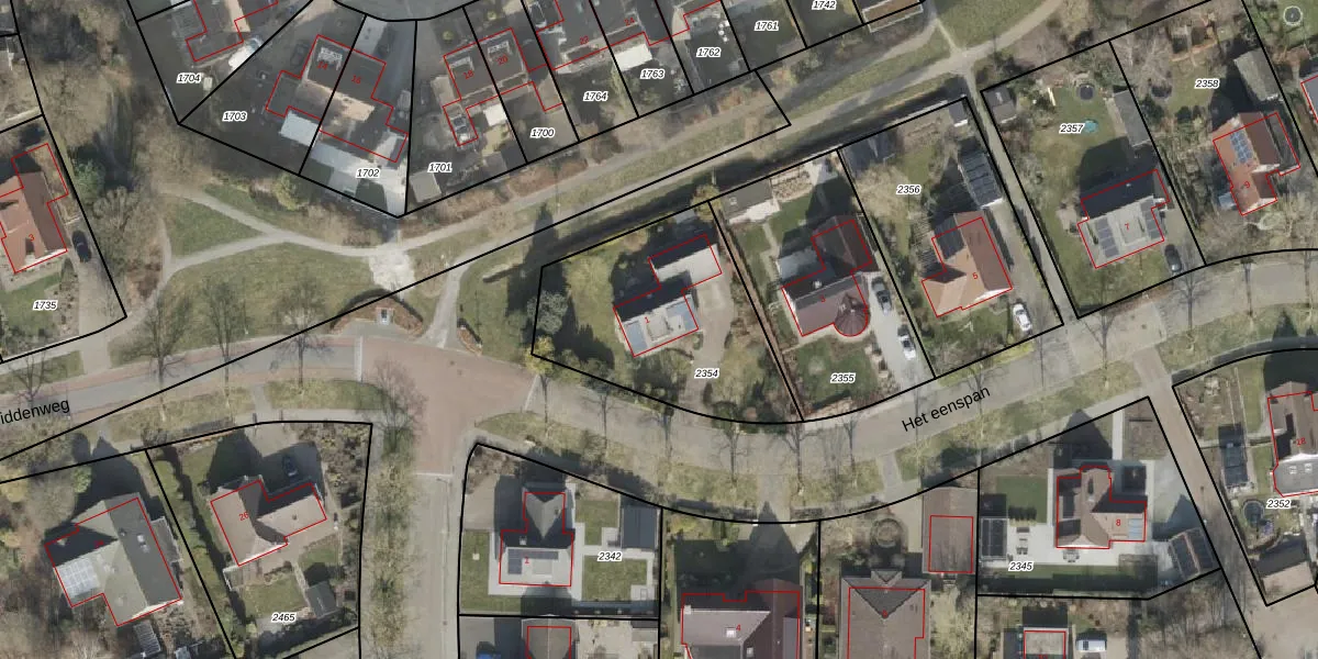 Het perceel waarop Het eenspan 1 staat heeft een oppervlakte van 842 m². Dit is een groot perceel. De perceeloppervlakte wordt geregistreerd door het Kadaster. Gedetailleerde informatie over de maten van dit perceel kunt u vinden in het rapport Kadastrale kaart met maatvoering van Het eenspan 1.