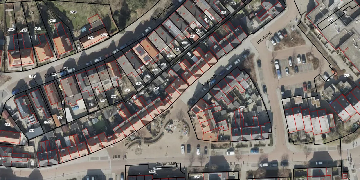 Het perceel waarop Irisstraat 24 staat heeft een oppervlakte van 3060 m². Dit is een zeer groot perceel. De perceeloppervlakte wordt geregistreerd door het Kadaster. Gedetailleerde informatie over de maten van dit perceel kunt u vinden in het rapport Kadastrale kaart met maatvoering van Irisstraat 24.