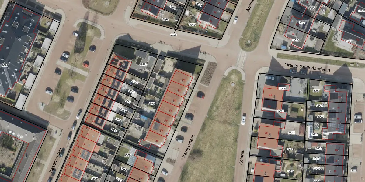 Het perceel waarop Kampement 25 staat heeft een oppervlakte van 1305 m². Dit is een zeer groot perceel. De perceeloppervlakte wordt geregistreerd door het Kadaster. Gedetailleerde informatie over de maten van dit perceel kunt u vinden in het rapport Kadastrale kaart met maatvoering van Kampement 25.
