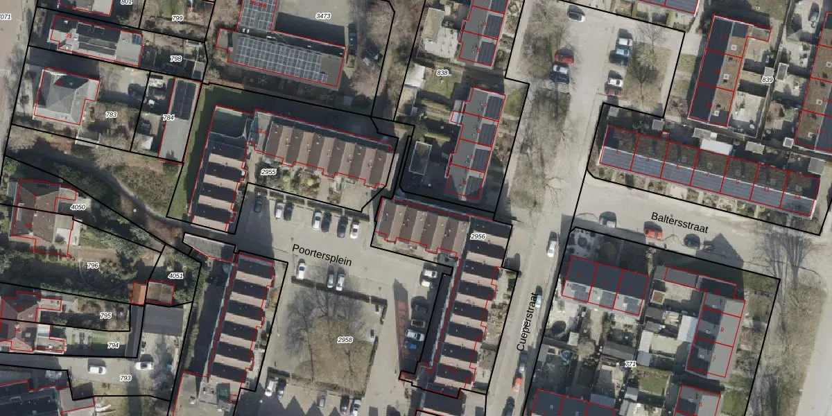 Het perceel waarop Poortersplein 12 staat heeft een oppervlakte van 1009 m². Dit is een zeer groot perceel. De perceeloppervlakte wordt geregistreerd door het Kadaster. Gedetailleerde informatie over de maten van dit perceel kunt u vinden in het rapport Kadastrale kaart met maatvoering van Poortersplein 12.