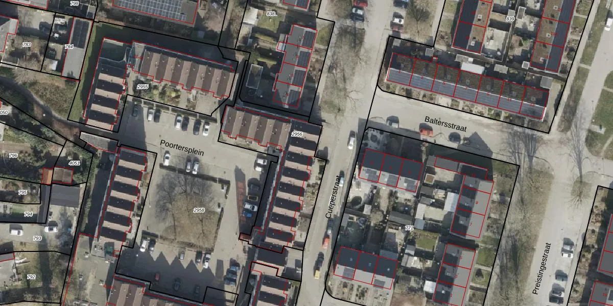 Het perceel waarop Poortersplein 19 staat heeft een oppervlakte van 1009 m². Dit is een zeer groot perceel. De perceeloppervlakte wordt geregistreerd door het Kadaster. Gedetailleerde informatie over de maten van dit perceel kunt u vinden in het rapport Kadastrale kaart met maatvoering van Poortersplein 19.