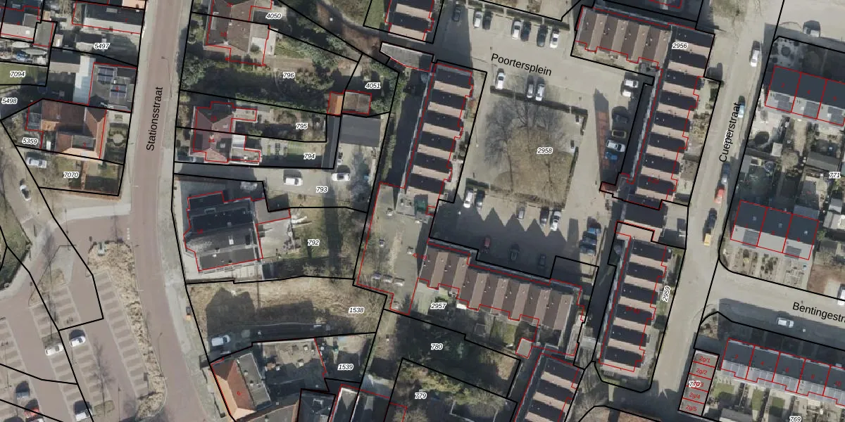 Het perceel waarop Poortersplein 44 staat heeft een oppervlakte van 2452 m². Dit is een zeer groot perceel. De perceeloppervlakte wordt geregistreerd door het Kadaster. Gedetailleerde informatie over de maten van dit perceel kunt u vinden in het rapport Kadastrale kaart met maatvoering van Poortersplein 44.