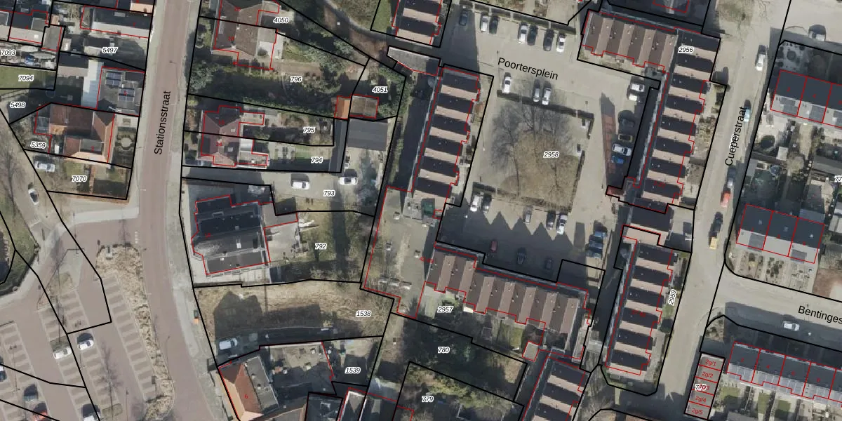 Het perceel waarop Poortersplein 53 staat heeft een oppervlakte van 2452 m². Dit is een zeer groot perceel. De perceeloppervlakte wordt geregistreerd door het Kadaster. Gedetailleerde informatie over de maten van dit perceel kunt u vinden in het rapport Kadastrale kaart met maatvoering van Poortersplein 53.