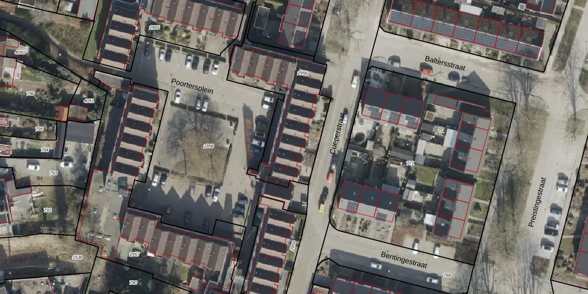 Het perceel waarop Poortersplein 7 staat heeft een oppervlakte van 1009 m². Dit is een zeer groot perceel. De perceeloppervlakte wordt geregistreerd door het Kadaster. Gedetailleerde informatie over de maten van dit perceel kunt u vinden in het rapport Kadastrale kaart met maatvoering van Poortersplein 7.