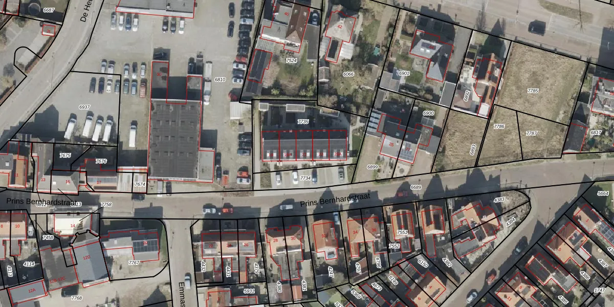 Het perceel waarop Prins Bernhardstraat 21 staat heeft een oppervlakte van 754 m². Dit is een groot perceel. De perceeloppervlakte wordt geregistreerd door het Kadaster. Gedetailleerde informatie over de maten van dit perceel kunt u vinden in het rapport Kadastrale kaart met maatvoering van Prins Bernhardstraat 21.