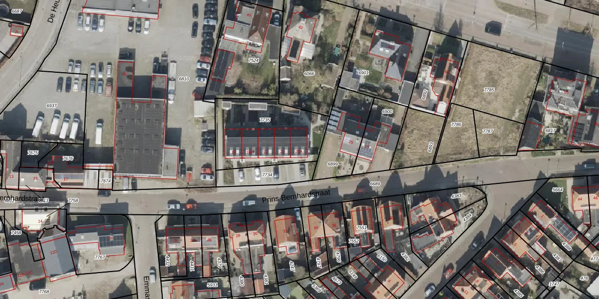 Het perceel waarop Prins Bernhardstraat 23-A staat heeft een oppervlakte van 754 m². Dit is een groot perceel. De perceeloppervlakte wordt geregistreerd door het Kadaster. Gedetailleerde informatie over de maten van dit perceel kunt u vinden in het rapport Kadastrale kaart met maatvoering van Prins Bernhardstraat 23-A.