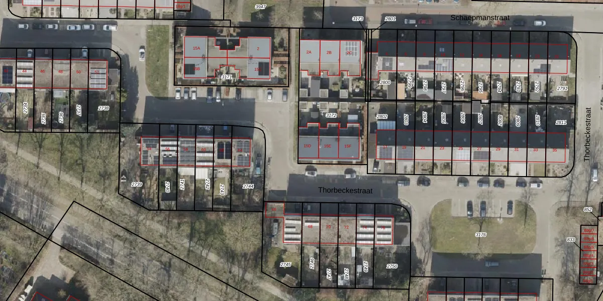 Het perceel waarop Thorbeckestraat 15-D staat heeft een oppervlakte van 1016 m². Dit is een zeer groot perceel. De perceeloppervlakte wordt geregistreerd door het Kadaster. Gedetailleerde informatie over de maten van dit perceel kunt u vinden in het rapport Kadastrale kaart met maatvoering van Thorbeckestraat 15-D.