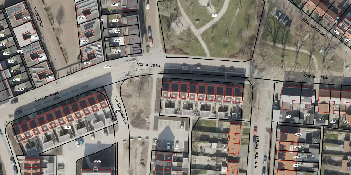 Het perceel waarop Vondelstraat 29 staat heeft een oppervlakte van 3075 m². Dit is een zeer groot perceel. De perceeloppervlakte wordt geregistreerd door het Kadaster. Gedetailleerde informatie over de maten van dit perceel kunt u vinden in het rapport Kadastrale kaart met maatvoering van Vondelstraat 29.