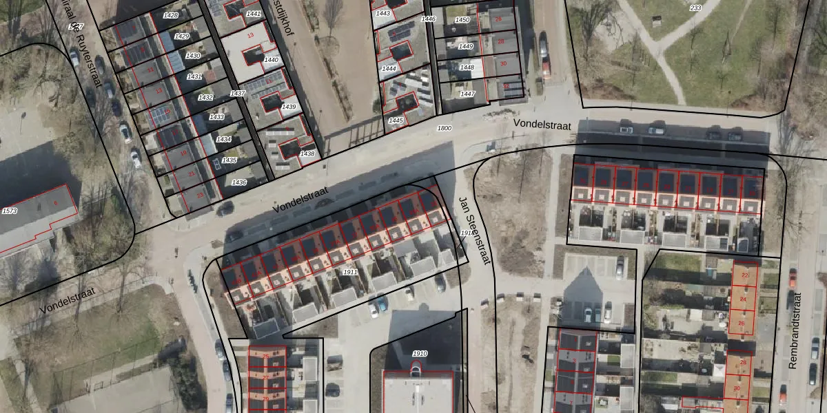 Het perceel waarop Vondelstraat 33-A staat heeft een oppervlakte van 1905 m². Dit is een zeer groot perceel. De perceeloppervlakte wordt geregistreerd door het Kadaster. Gedetailleerde informatie over de maten van dit perceel kunt u vinden in het rapport Kadastrale kaart met maatvoering van Vondelstraat 33-A.