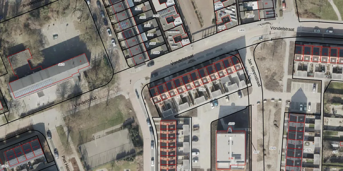 Het perceel waarop Vondelstraat 41 staat heeft een oppervlakte van 1905 m². Dit is een zeer groot perceel. De perceeloppervlakte wordt geregistreerd door het Kadaster. Gedetailleerde informatie over de maten van dit perceel kunt u vinden in het rapport Kadastrale kaart met maatvoering van Vondelstraat 41.