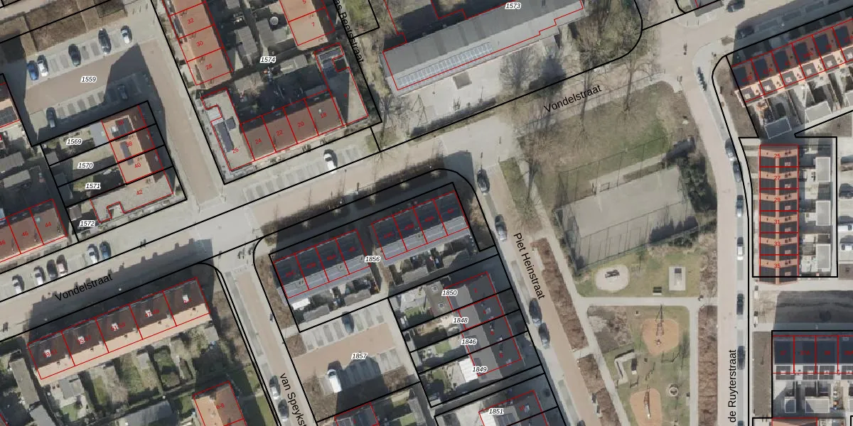 Het perceel waarop Vondelstraat 43-A staat heeft een oppervlakte van 915 m². Dit is een groot perceel. De perceeloppervlakte wordt geregistreerd door het Kadaster. Gedetailleerde informatie over de maten van dit perceel kunt u vinden in het rapport Kadastrale kaart met maatvoering van Vondelstraat 43-A.