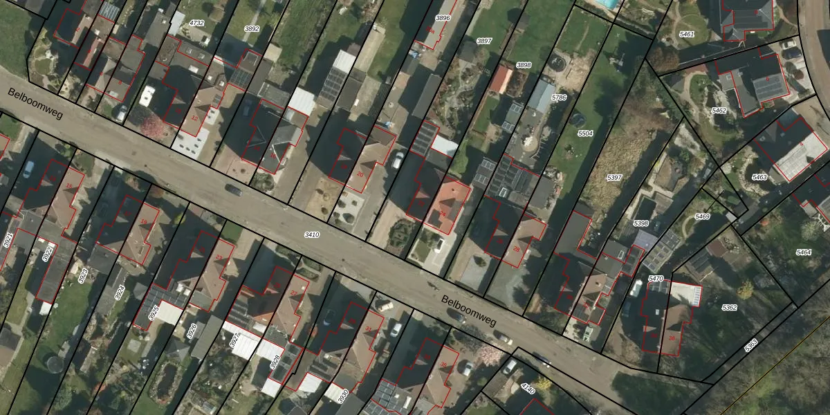 Het perceel waarop Belboomweg 22 staat heeft een oppervlakte van 975 m². Dit is een groot perceel. De perceeloppervlakte wordt geregistreerd door het Kadaster. Gedetailleerde informatie over de maten van dit perceel kunt u vinden in het rapport Kadastrale kaart met maatvoering van Belboomweg 22.
