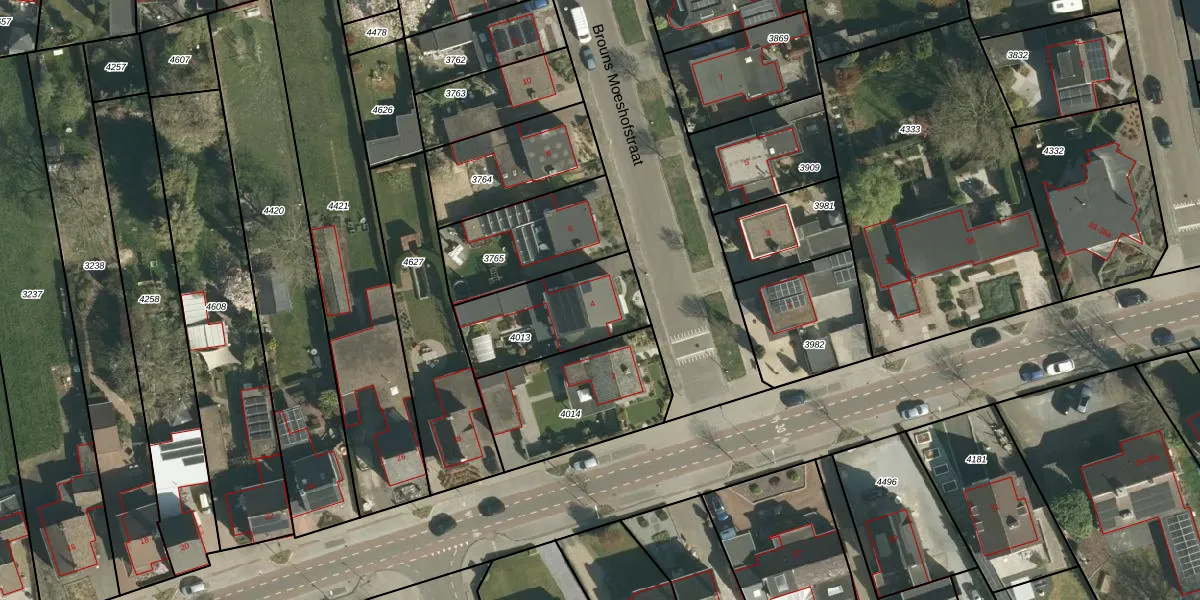 Brouns Moeshofstraat 4 is gelegen op kadastraal perceel STE00C4013. Deze kadastrale aanduiding is uniek en wordt gebruikt door het Kadaster om eigendomsrechten en andere zakelijke rechten vast te leggen. Het perceel maakt onderdeel uit van de kadastrale gemeente Stein.