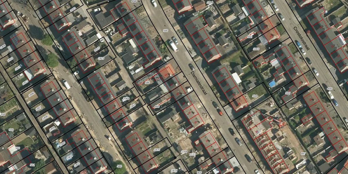 Het perceel waarop Damiatestraat 42 staat heeft een oppervlakte van 2045 m². Dit is een zeer groot perceel. De perceeloppervlakte wordt geregistreerd door het Kadaster. Gedetailleerde informatie over de maten van dit perceel kunt u vinden in het rapport Kadastrale kaart met maatvoering van Damiatestraat 42.