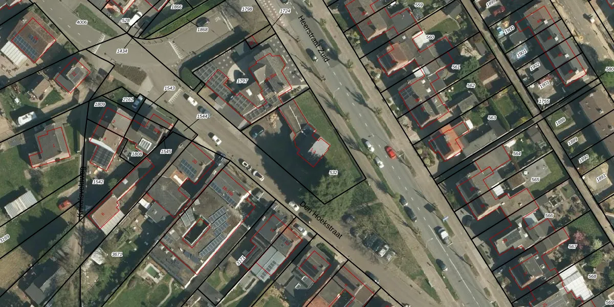Den Hoekstraat 1 is gelegen op kadastraal perceel STE00G532. Deze kadastrale aanduiding is uniek en wordt gebruikt door het Kadaster om eigendomsrechten en andere zakelijke rechten vast te leggen. Het perceel maakt onderdeel uit van de kadastrale gemeente Stein.