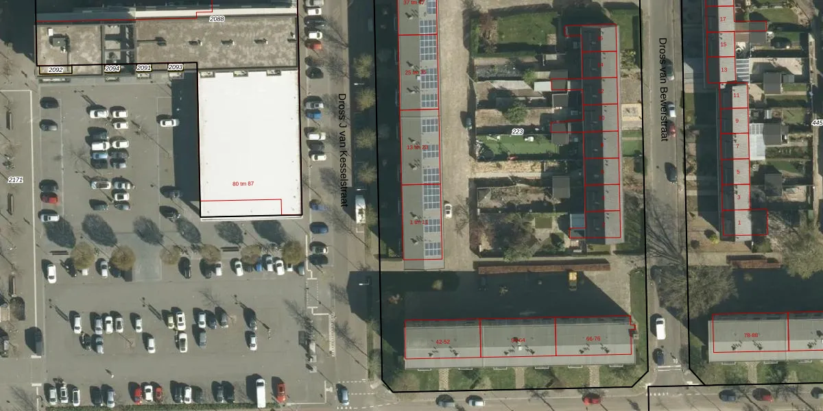 Het perceel waarop Dross J van Kesselstraat 3 staat heeft een oppervlakte van 7405 m². Dit is een zeer groot perceel. De perceeloppervlakte wordt geregistreerd door het Kadaster. Gedetailleerde informatie over de maten van dit perceel kunt u vinden in het rapport Kadastrale kaart met maatvoering van Dross J van Kesselstraat 3.