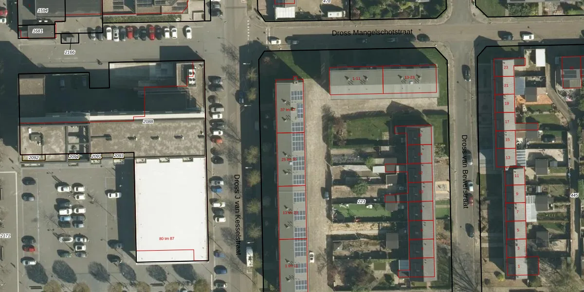 Het perceel waarop Dross J van Kesselstraat 31 staat heeft een oppervlakte van 7405 m². Dit is een zeer groot perceel. De perceeloppervlakte wordt geregistreerd door het Kadaster. Gedetailleerde informatie over de maten van dit perceel kunt u vinden in het rapport Kadastrale kaart met maatvoering van Dross J van Kesselstraat 31.
