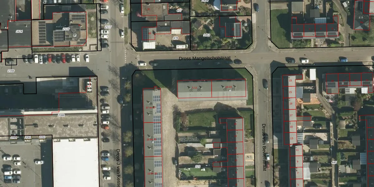 Het perceel waarop Dross Mangelschotstraat 1-GA65 staat heeft een oppervlakte van 7405 m². Dit is een zeer groot perceel. De perceeloppervlakte wordt geregistreerd door het Kadaster. Gedetailleerde informatie over de maten van dit perceel kunt u vinden in het rapport Kadastrale kaart met maatvoering van Dross Mangelschotstraat 1-GA65.