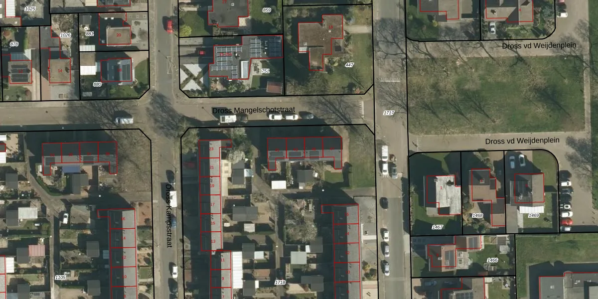 Dross Mangelschotstraat 43 is gelegen op kadastraal perceel STE00G1718. Deze kadastrale aanduiding is uniek en wordt gebruikt door het Kadaster om eigendomsrechten en andere zakelijke rechten vast te leggen. Het perceel maakt onderdeel uit van de kadastrale gemeente Stein.