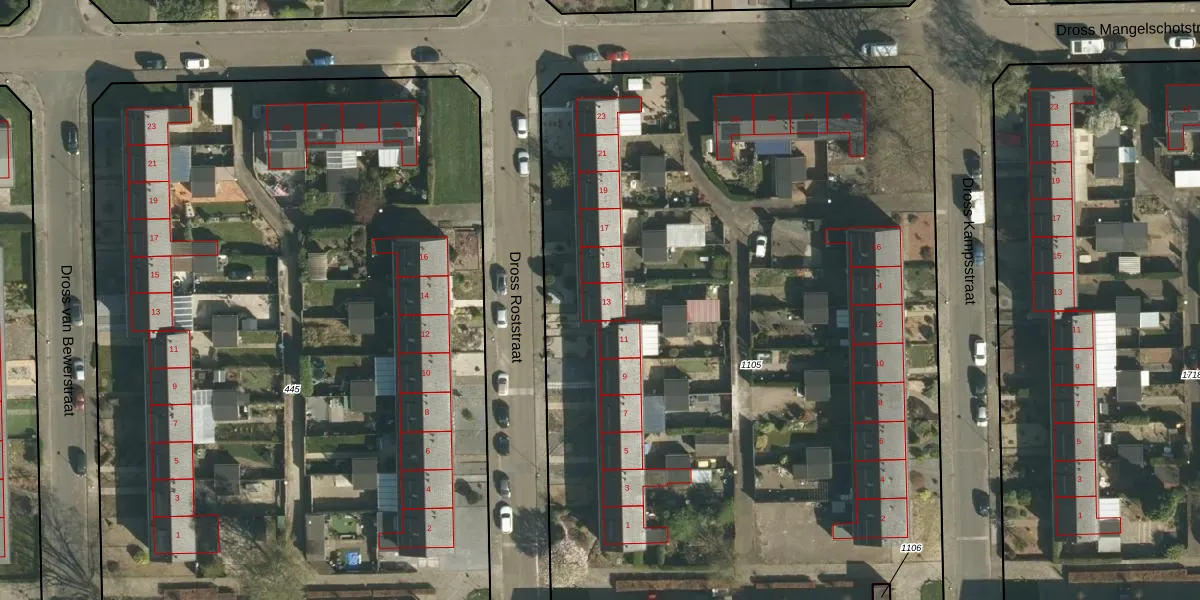 Dross Roststraat 13 is gelegen op kadastraal perceel STE00G1105. Deze kadastrale aanduiding is uniek en wordt gebruikt door het Kadaster om eigendomsrechten en andere zakelijke rechten vast te leggen. Het perceel maakt onderdeel uit van de kadastrale gemeente Stein.