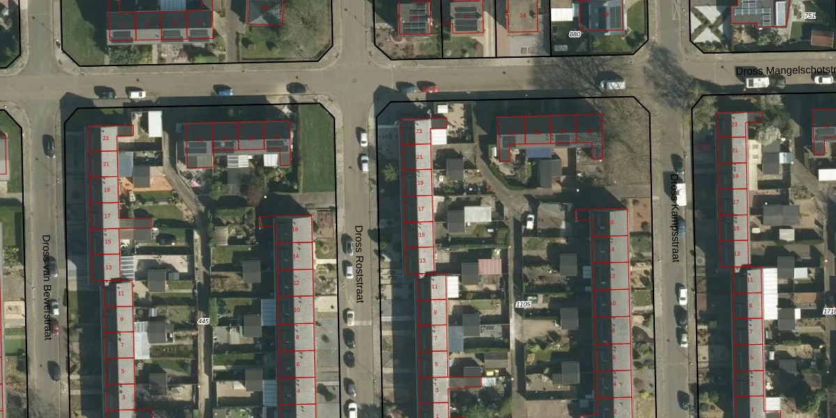 Het perceel waarop Dross Roststraat 17 staat heeft een oppervlakte van 7469 m². Dit is een zeer groot perceel. De perceeloppervlakte wordt geregistreerd door het Kadaster. Gedetailleerde informatie over de maten van dit perceel kunt u vinden in het rapport Kadastrale kaart met maatvoering van Dross Roststraat 17.