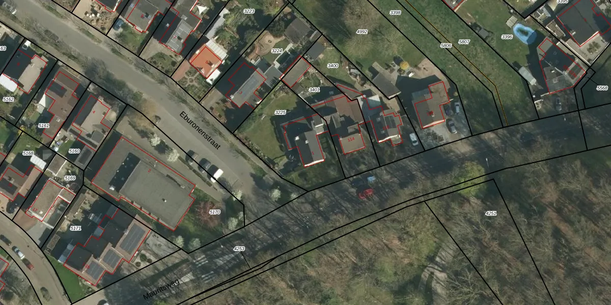Het perceel waarop Eburonenstraat 1 staat heeft een oppervlakte van 731 m². Dit is een groot perceel. De perceeloppervlakte wordt geregistreerd door het Kadaster. Gedetailleerde informatie over de maten van dit perceel kunt u vinden in het rapport Kadastrale kaart met maatvoering van Eburonenstraat 1.