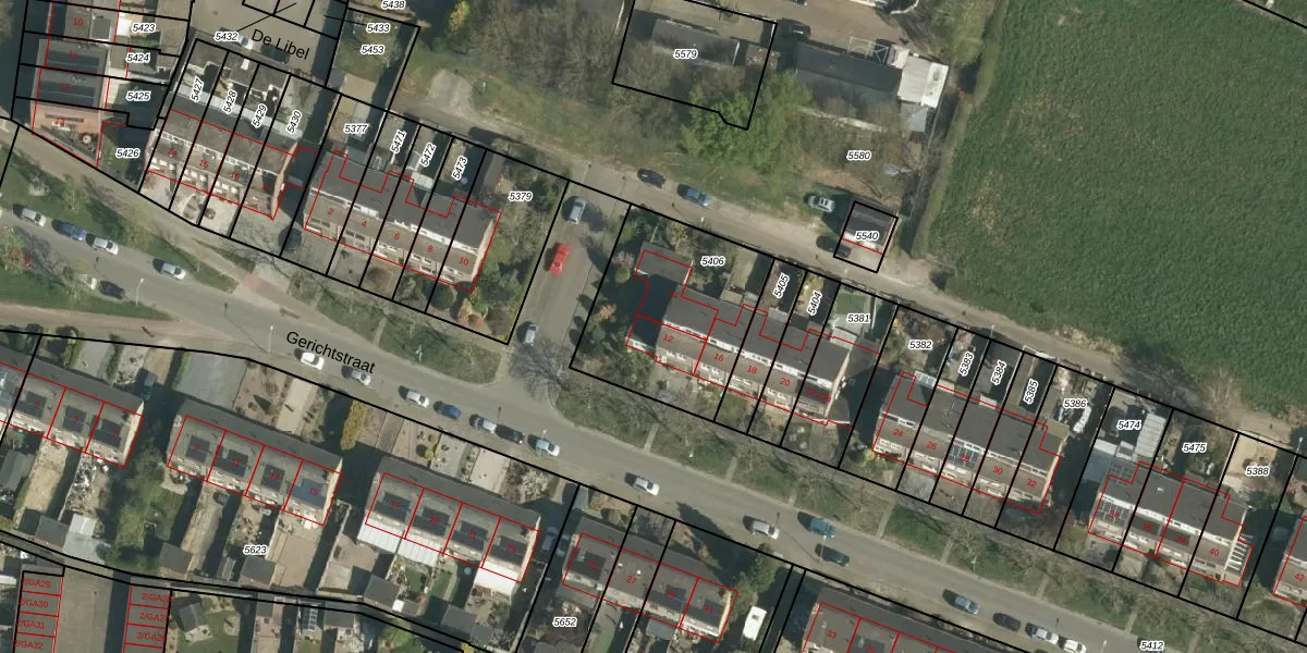 Het perceel waarop Gerichtstraat 12 staat heeft een oppervlakte van 614 m². Dit is een groot perceel. De perceeloppervlakte wordt geregistreerd door het Kadaster. Gedetailleerde informatie over de maten van dit perceel kunt u vinden in het rapport Kadastrale kaart met maatvoering van Gerichtstraat 12.