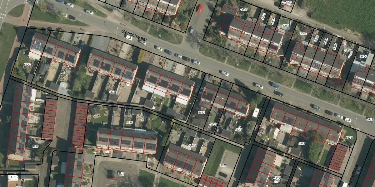 Het perceel waarop Gerichtstraat 23 staat heeft een oppervlakte van 2720 m². Dit is een zeer groot perceel. De perceeloppervlakte wordt geregistreerd door het Kadaster. Gedetailleerde informatie over de maten van dit perceel kunt u vinden in het rapport Kadastrale kaart met maatvoering van Gerichtstraat 23.