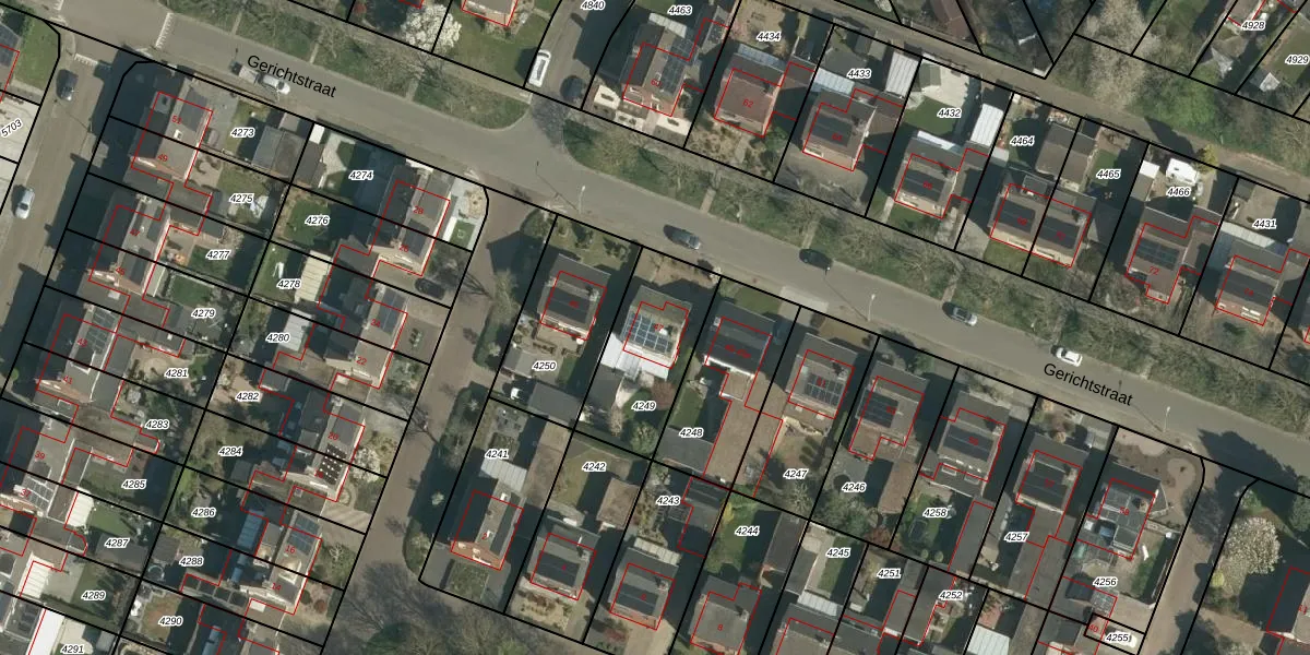 Het perceel waarop Gerichtstraat 47 staat heeft een oppervlakte van 387 m². Dit is een groot perceel. De perceeloppervlakte wordt geregistreerd door het Kadaster. Gedetailleerde informatie over de maten van dit perceel kunt u vinden in het rapport Kadastrale kaart met maatvoering van Gerichtstraat 47.