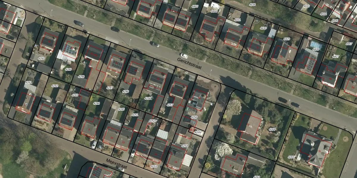 Het perceel waarop Gerichtstraat 57 staat heeft een oppervlakte van 395 m². Dit is een groot perceel. De perceeloppervlakte wordt geregistreerd door het Kadaster. Gedetailleerde informatie over de maten van dit perceel kunt u vinden in het rapport Kadastrale kaart met maatvoering van Gerichtstraat 57.
