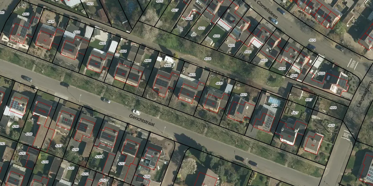 Het perceel waarop Gerichtstraat 74 staat heeft een oppervlakte van 383 m². Dit is een groot perceel. De perceeloppervlakte wordt geregistreerd door het Kadaster. Gedetailleerde informatie over de maten van dit perceel kunt u vinden in het rapport Kadastrale kaart met maatvoering van Gerichtstraat 74.